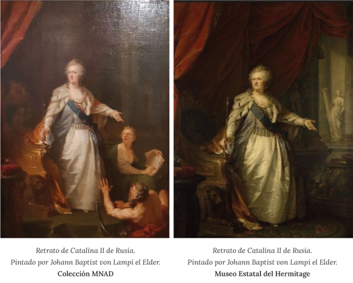 La segunda obra es el famoso retrato ceremonial de Catalina II, realizado por Johann-Baptiste Lampi el Viejo (3), invitado a visitar Rusia por Potemkin. El MNAD contiene un boceto de Catalina II (4) con figuras alegóricas de Saturno e Historia. Sin embargo, el retrato final5 que se encuentra en el Hermitage no las posee.